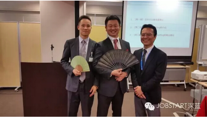 【圖片說明:圖為杰博人力資源有限公司總經(jīng)理張林先生(左)向Recruit集團所屬研究發(fā)展與派遣公司社長松原伸明先生(中)贈送從杭州精選之絲綢扇,寓意人力資源是一項有意義的事業(yè)】